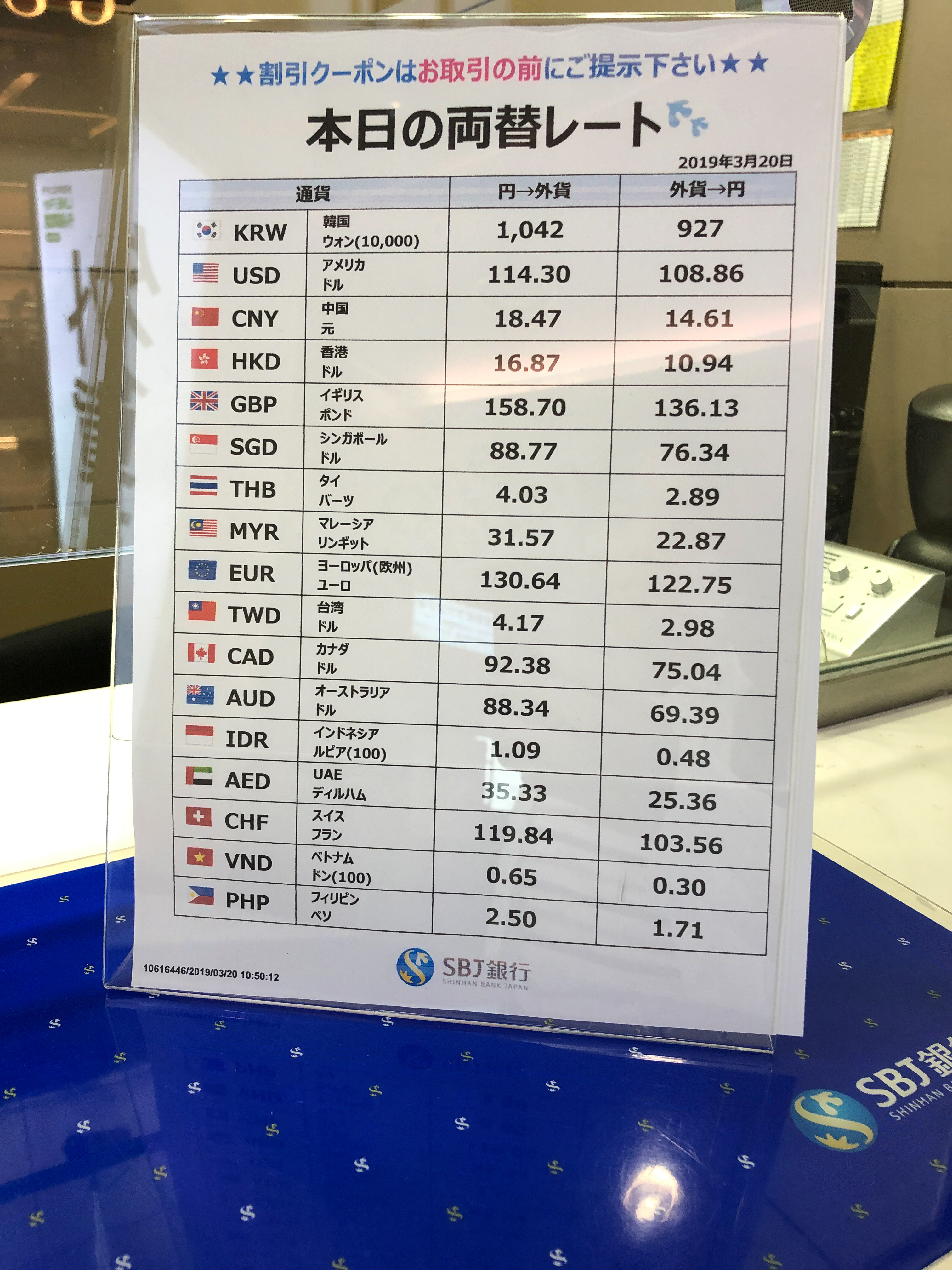 SBJ銀行本日の両替レート(2019/03/21)SBJ銀行本日の両替レート(2019/03/21)